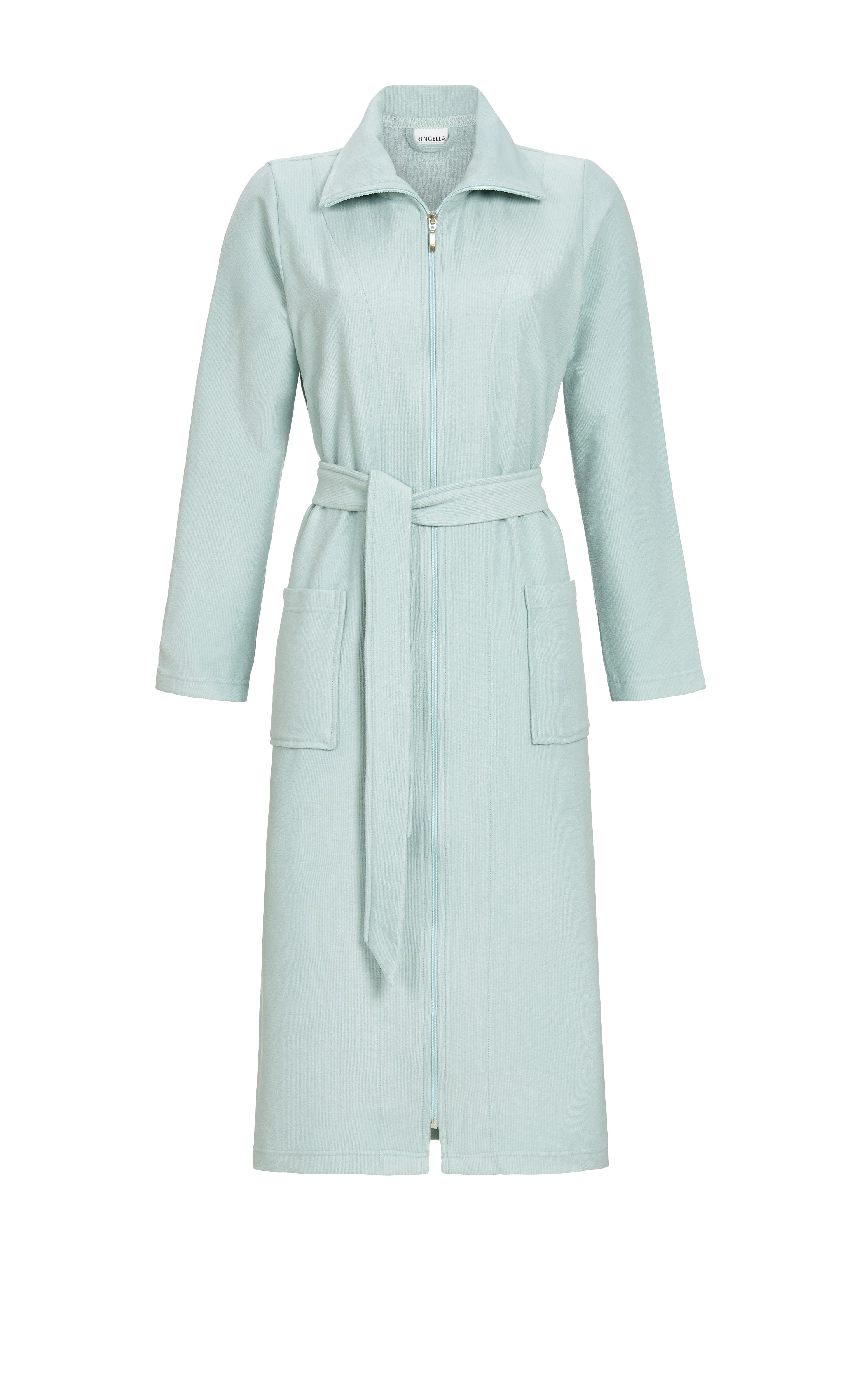 Ein kuscheliger Begleiter ist dieser Reißverschluß-Mantel mit Kragen. Ein Bindegürtel reguliert die Weite. Praktisch sind die aufgesetzten Taschen. Der Mantel aus Velours-Frottee hat aussen die Velours- und innen die Frotteeseite. Dieses Material bietet vollsten Wohlfühlkomfort, reguliert die Feuchtigkeit und ist pflegeleicht.